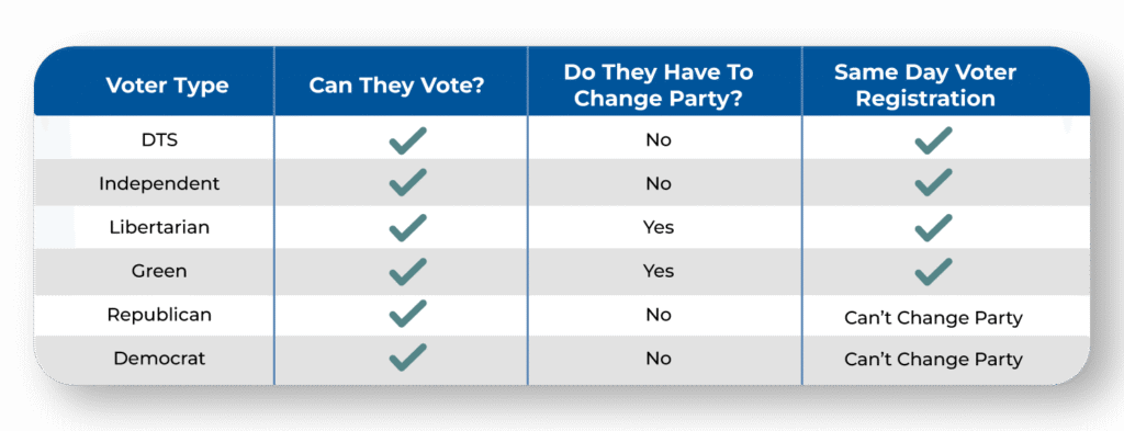 - Is available for DTS voters and allows them to use either the Republican Party or Democratic Party ballot.